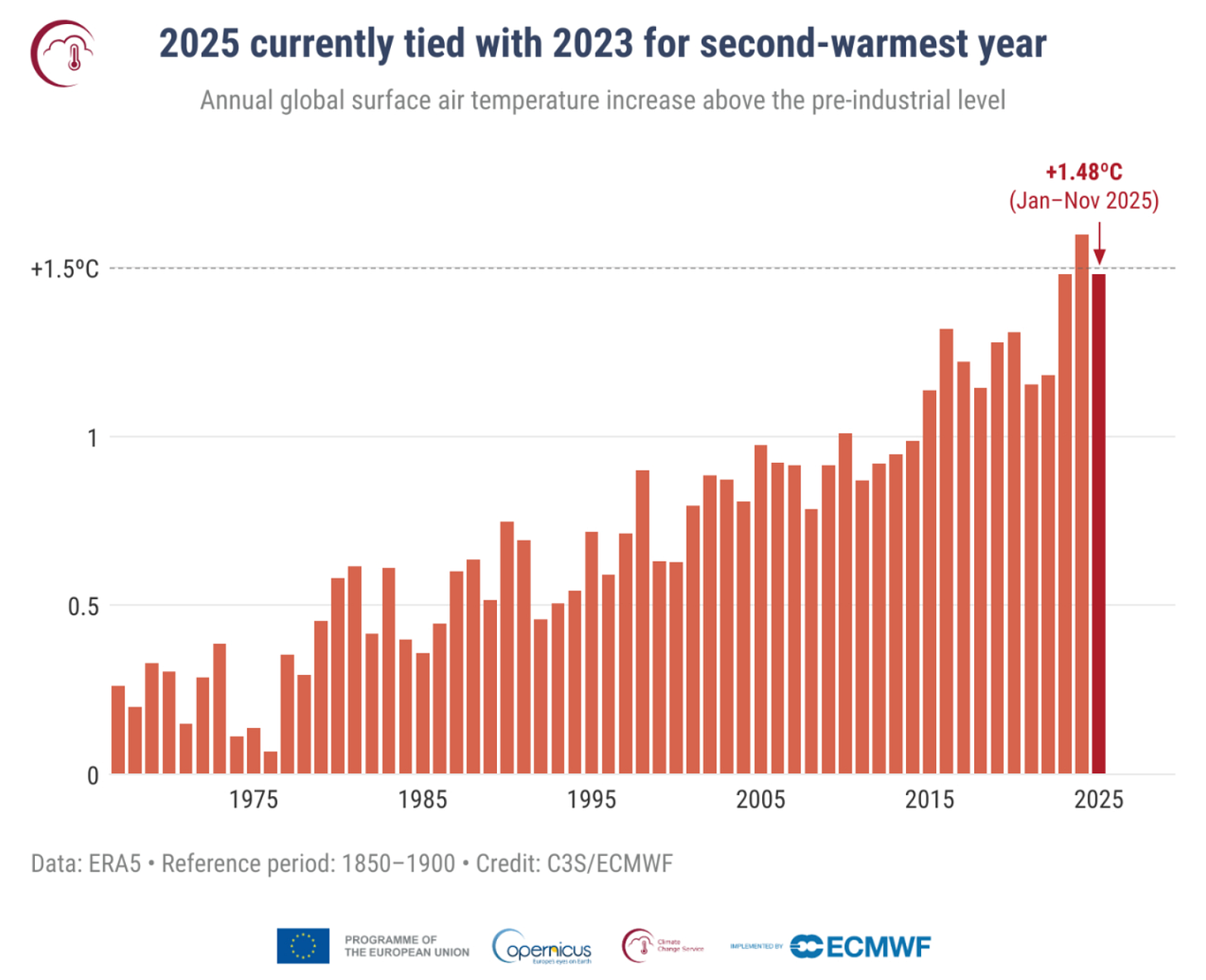 This year is currently tied with 2023 to be the second-warmest year on record, according to new data from the Copernicus Climate Change Service. The monthly climate update also reveals November 2025 was the third-warmest globally, with notably warmer-than-average temperatures recorded across Northern Canada and the Arctic Ocean. The month was marked by a number of extreme weather events, including tropical cyclones in Southeast Asia, causing widespread, catastrophic flooding and loss of life, CCCS says. Samantha Burgess, strategic lead for climate at the European Centre for Medium-Range Weather Forecasts, said, “For November, global temperatures were 1.54°C above pre-industrial levels, and the three-year average for 2023–2025 is on track to exceed 1.5°C for the first time. These milestones are not abstract — they reflect the accelerating pace of climate change and the only way to mitigate future rising temperatures is to rapidly reduce greenhouse gas emissions.”
