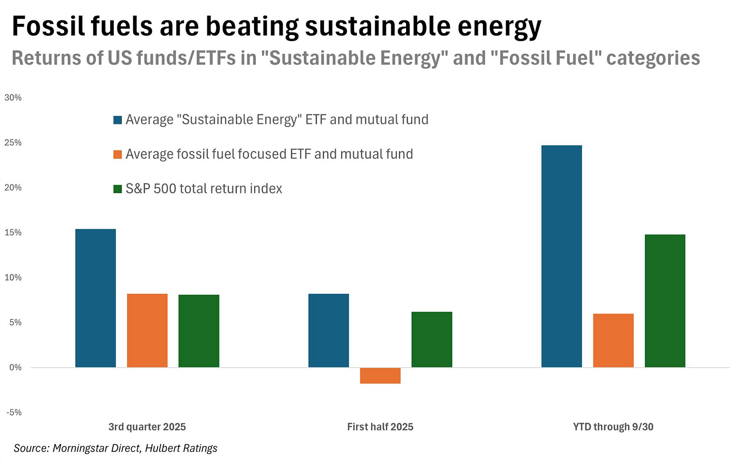 I’m referring to the market-beating returns of mutual funds and ETFs that focus on sustainable energy. You may recall that, three months ago at 2025’s half-way mark, I reported that these funds on average had outperformed the typical fossil fuel fund and ETF for year-to-date performance — notwithstanding President Donald Trump’s “drill, baby, drill” energy policy.