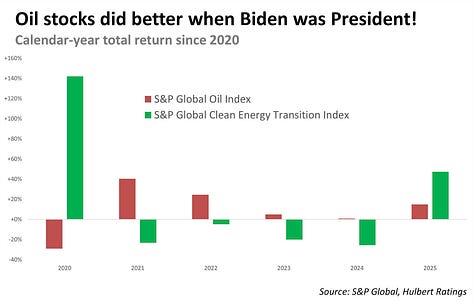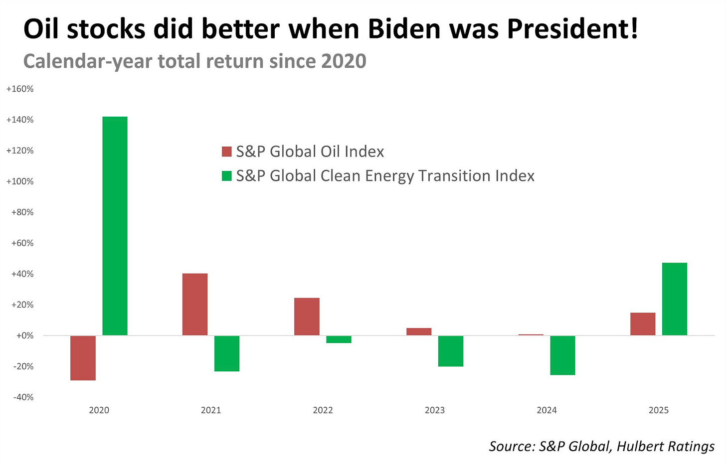 . . . . Renewable energy stocks trounced oil and gas stocks in 2025, despite a year of punishing cutbacks and closures of green projects by the Trump Administration, writes Mark Hulbert. Green stocks also beat oil during Trump’s first term, suggesting that the pace of demand for clean, cheaper energy outweighs any political rhetoric in investors’ minds. In fact, oil and gas stocks did better under Joe Biden. Perhaps 50 million more barrels of oil from Venezuela will change that dynamic, but that’s unlikely as long as big tech data centers are hungry for cheap energy.