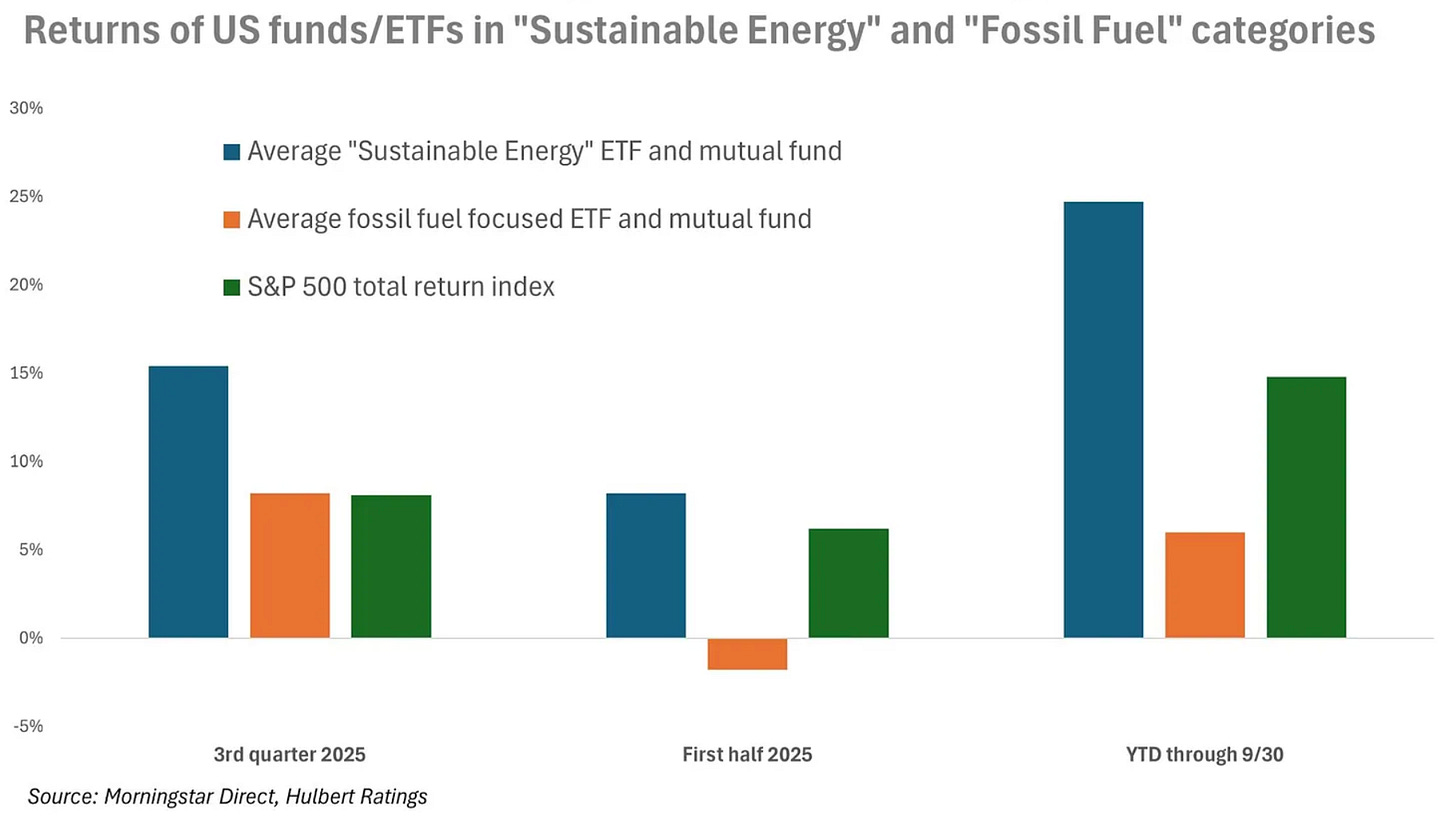 . . . . Sustainable funds, which have defied President Donald Trump’s attempts to kill clean energy this year, expanded their gains in the third quarter as U.S. demand for more energy to propel the AI revolution pushed renewables forward, writes Mark Hulbert. Gains of more than 15% in green funds and ETFs almost doubled those of oil and gas assets, exposing the myth of “drill, baby, drill.” Hulbert points out several stocks leading the charge, with one up more than 50%, as the AI mania spreads into the energy markets.
