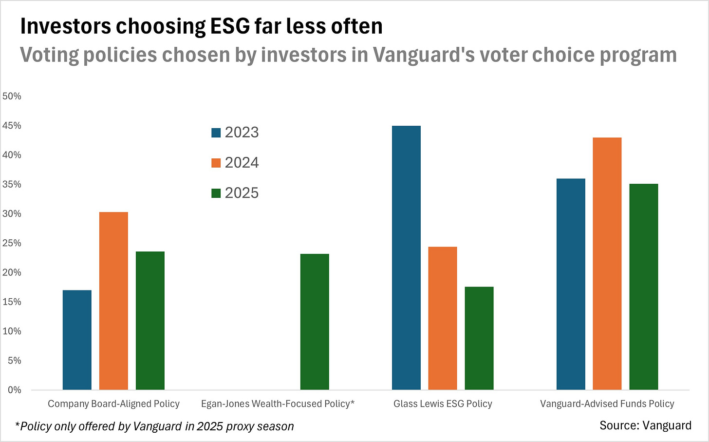 . . . . Mutual fund giants report a surge in investors participating in new proxy voting programs, with Vanguard, BlackRock, and State Street all claiming higher numbers of investors eligible to take part this year, writes Mark Hulbert. At the same time, the number of shareholders voting ESG-specific proxies plunged — at Vanguard by about half. Hulbert tries to make sense of the disconnect and finds that it’s a combination of a confusing voting process steps and the sheer legal bulk of these types of policies.