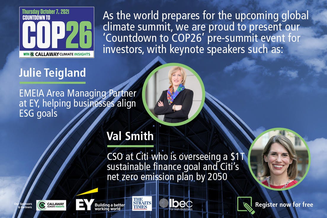 Presenting Countdown to COP26: an investor guide to the world’s most important climate summit, a special event by Callaway Climate Insights, with hosts EY, IBEC, and media partner The Straits Times of Singapore.