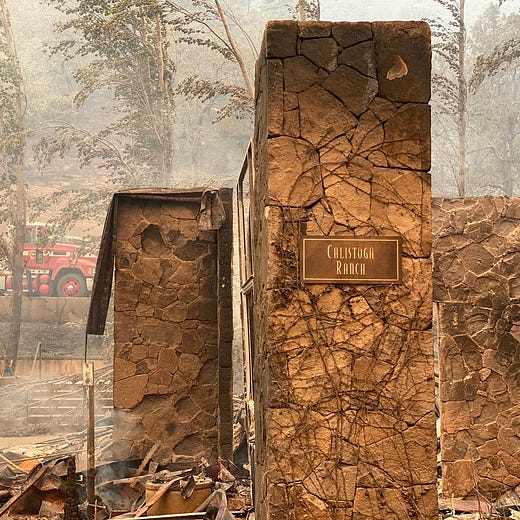 The fire also did extensive damage to the luxury Calistoga Ranch, an Auberge Collections resort north of Meadowood. Chateau Boswell, an historic winery in St. Helena on the Silverado Trail, was destroyed; and across the valley floor, Castello di Amorosa’s huge storage building, holding millions of dollars in bottled wine, was razed.