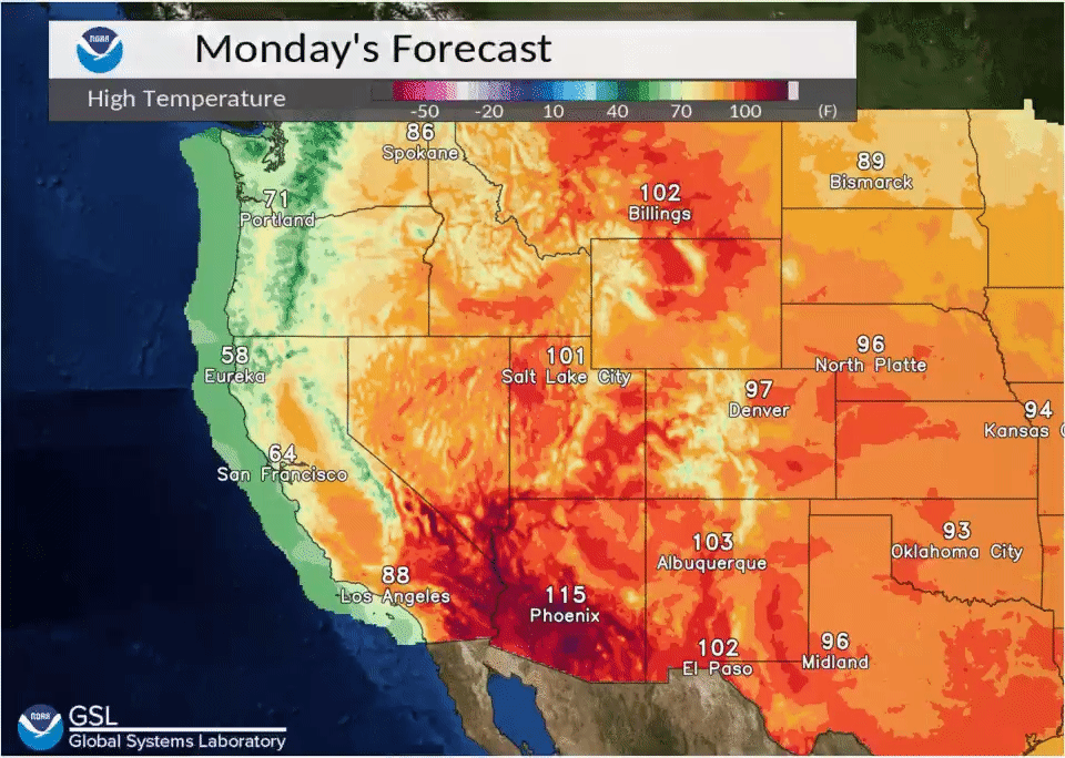 The National Weather Service says dangerous heat will affect much of the western U.S. this week, with temperatures up to 120°F. Forecasters say this heat wave will be record-breaking, not only for the high temps, but also for how long it will last.
